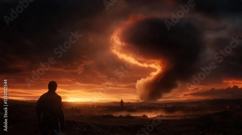 sunset, storm, landscape, silhouette, sky, cloud, tower, man, nature, apocalypse, dramatic, desolate, ruin, wasteland, disaster, danger, atmospheric, environment, outdoors, dark, orange, horizon, cloudy, dusk, twilight, person, back, alone, hope, future, end, mystery, fantasy, surreal, scenic, panorama, view, freedom, adventure, exploration, contemplation, journey, strength