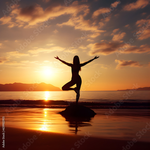 silhouette woman doing yoga on the beach surrounded by orange clouds