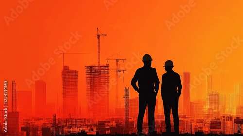 Silhouetted Builders Overseeing Urban Construction Against Vibrant Orange Sunset