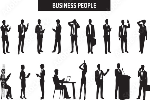 Silhouetted Business Professionals Showcasing Diverse Poses and Activities Representing Corporate Life with Briefcase, Podium, and Technology Utilization