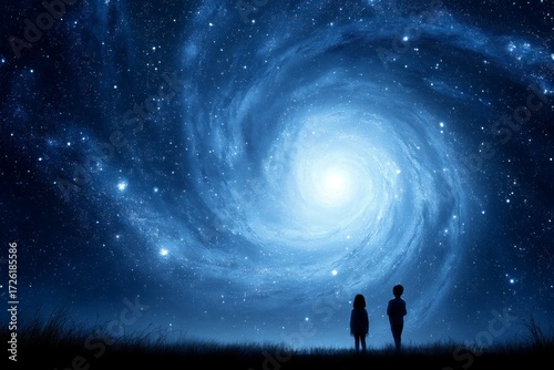 galaxy, children, night, sky, spiral, silhouetted, cosmic, universe, star, awe, wonder, silhouette, grass, horizon, celestial, male, female, young, exploration, cosmos, space, forever, dazzling, mystery, immensity, nightscape, dreamlike, astronomy, majestic, enchanting, surreal, infinite, aethereal, astro, atmosphere, gloaming, quiet, calmness, observing