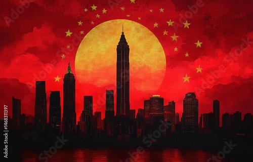 Silhouetted city skyline with tall skyscrapers against a large glowing sun and a red sky decorated with multiple stars, evoking a dramatic and intense atmosphere