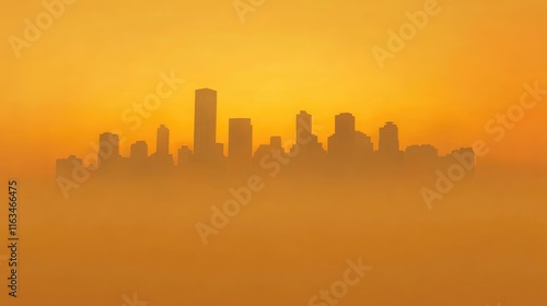 city landscape, skyline, fog, morning, gold, silhouette, building, urban, sunrise, hazy, mist, atmospheric, architecture, metropolitan, city, horizon, serene, dawn, skyscraper, landscape, tranquil, dusk, panoramic, aethereal, sky, towering, ambient, yellow, orange, misty, calm, enchanting, smog, quiet, peaceful, sunlight, surreal, dreamy, glowing, abstract, shadowed, soft, huge