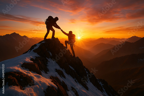 Silhouetted climbers reaching snowy mountain summit during golden sunset, symbolizing teamwork and perseverance