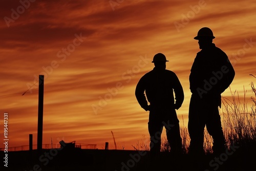 construction, men at work, sunset, silhouette, labor, teamwork, industry, work, profession, safety, hard hat, sky, manual labor, scene, dusk, union, project, environment, architecture, equipment, orange, nature, landscape, evening, shadow, bright, profile, 2, standing, horizon, view, infrastructure, site, men at work, rural, communication, posing, group, skill, dedication, job site, hard work