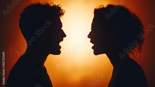 silhouette, couple, arguing, sunset, background, orange, red, man, woman, human relationships, conflict, love, anger, frustration, challenged, disagreement, passion, emotion, communication, talking, screaming, yell, face, hair, profile, side, light, dark, contrast, dramatic, moody, intense, intimate, sharpened, portrait, photo, art, aesthetic, feeling, moment, life, human, together, separate, isolated, alone, distance, hope