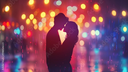 Silhouetted couple embracing in rain, city lights bokeh background.