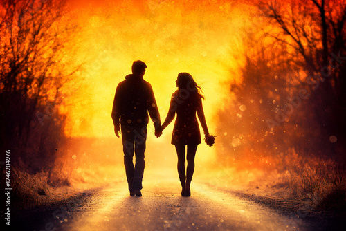 couple, silhouette, sunset, path, road, walking, holding hands, love, romance, affection, together, human relationships, intimacy, golden hour, warm light, backview, winter, autumn, tree, nature, outdoors, dreamy, magical, hopeful, future, journey, partnership, togetherness, hand in hand, evening, dusk, beautiful, peaceful, serene, calm, quiet, tender, gentle, loving couple