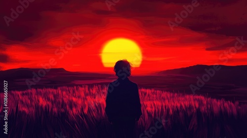 Silhouetted figure gazing at a vivid sunset horizon with warm red hues, surrounded by a field of tall grass, evoking a sense of hope and wonder.