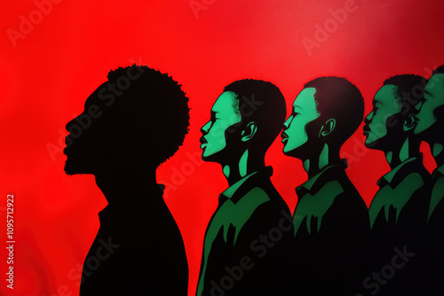 silhouette, profile, figure, red, vibrant, wallpainting, community, art, black, green, contrast, bold, striking, modern, urban, culture, expression, creativity, design, composition, visual, artistic, contemporary, street, public, installation, abstract, symbolic, representation, diversity, oneness, harmony, identity, perspective, collective, group, alignment, shadow, outline, form, shape, colours, background, texture, depth, dimension, dynamic