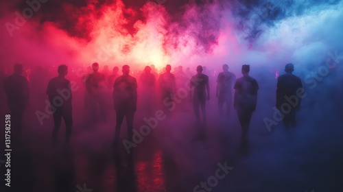figure, silhouette, crowd, smoke, fog, haze, colours, red, blue, purple, night, darkness, standing, group, event, party, concert, abstract, mysterious, atmosphere, light, neon, illuminated, vibrant, hazy, blurred, people, gathering, together, ominous, fantasy, stage, spreaded, vapour, cloud, texture, artistic, digital, surreal, modern, scene, dramatic, conceptual, aethereal