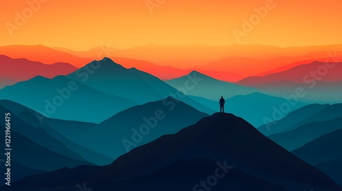 Silhouetted hiker standing alone on a rugged mountain peak gazing out at the endless breathtaking landscape of towering ridges and valleys bathed in the warm glow of the rising sun an epic