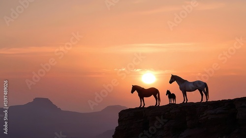Silhouetted horses on cliff edge at sunrise, peaceful landscape in nature.