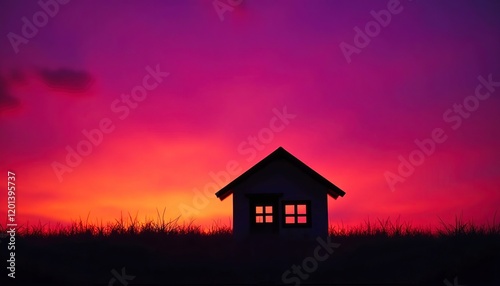 Silhouetted house at sunset. Vibrant colors paint the sky as a small house stands in a field of grass.
