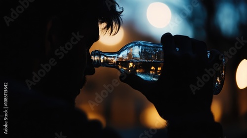 silhouette, man, drinking, alcohol, bottle, night, city, light, blurred, dark, shadow, lonely, sad, depressed, alcoholism, nightlife, urban, street, drink, glasses, liqueur, beer, wine, rum, vodka, gin, whiskey, bourbon, tequila, cocktail, bar, club, party, celebration, solitude, mood, pensive, thoughtful, feeling