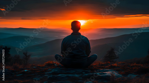 Silhouetted man meditates atop mountain, facing vibrant sunset over rolling hills.