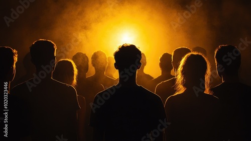 Silhouetted people facing a golden light, dramatic scene against a dark black background