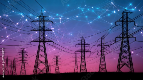 Silhouetted power lines against a vibrant sunset sky interconnected with digital nodes representing energy and technology.