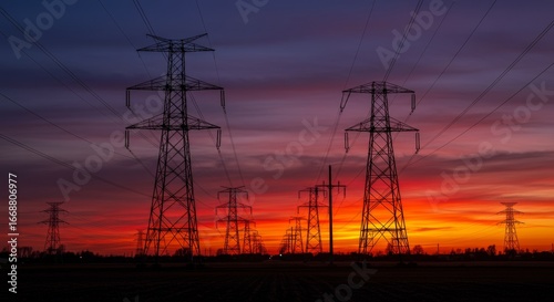 Silhouetted Power Lines at Sunset Stunning Transmission Towers Against a Vibrant Sky