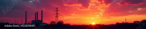 Silhouetted power plant against vibrant sunset sky, sunset, towers, solar