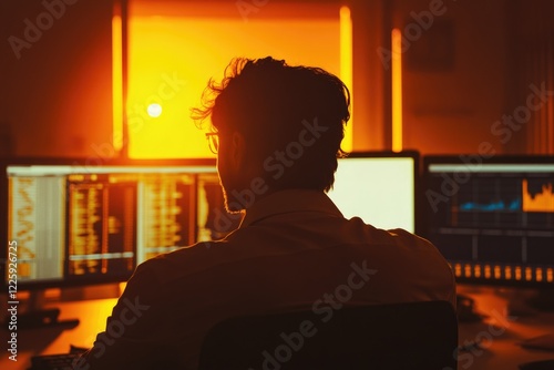 programmer, developer, coding, programming, computer, monitor, screen, code, datum, technology, silhouette, backview, warm light, glow, office, workplace, work, sharpened, concentration, dedication, hard work, digital, graph, chart, illuminated, desk, keyboard, computer programmer