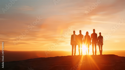Silhouetted team of professionals standing against a glowing sunset copy space, cohesion, surreal, silhouette, office rooftop