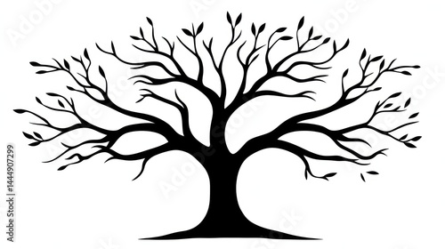 tree, nature, silhouette, deciduous, branch, leaf, root, trunk, illustration, graphic, design, black, white, art, vector, botanical, natural, plant, ecology, growth, life, earth, environment, wood, forest, foliage, landscape, season, autumn, winter, spring, summer, drawing, vignetting, simple, minimalist, organic, outline, isolated, image, beauty, symbol, strong, sturdy, powerful, aged, vibrant, abstract, shape