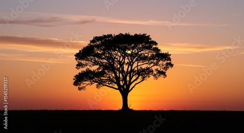 Silhouetted tree against vibrant sunset. Warm orange and pink sky gradient. Serene nature scene with wispy clouds.