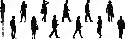 Silhouettes of business men and women walking and standing, professional attire, corporate office team, isolated on white background, modern business concept