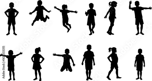 children, children, silhouette, black-and-white, jumping, playing, standing, posing, group, boy, girl, fun, childhood, activity, movement, youth, energy, happiness, joy, excitement, freedom, innocence, expressive, outline, family, togetherness, community, motion, people, school, park, playground, friends, carefree, dancing, leaping, body language, illustration, art, vector, social, interaction, diversity