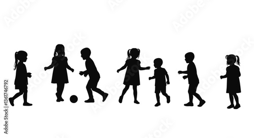 children, children, play, silhouette, outdoors, fun, active, children, boy, girl, toddler, preschool, game, sport, ball, black, white, background, simple, minimal, graphic, illustration, vector, design, happy