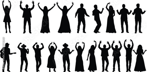 Silhouettes of dancing men and women in various poses including guitar player, party moves, and celebration gestures on white background