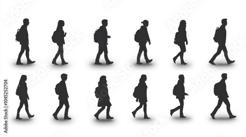 Silhouettes of diverse individuals walking, showcasing different styles and postures against a light background.