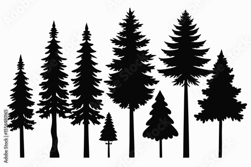 evergreen, tree, forest, silhouette, pine, fir, spruce, cedar, timberland, nature, outdoors, wood, graphic, design, illustration, vector, black, white, simple, minimalist, christmas, holiday, winter, nature scene, botanical, conifer, tall, short, group, collection, isolated, background, element, clip art, image, artwork