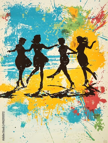 Silhouettes of four women dancing on the beach with a colorful abstract background.
