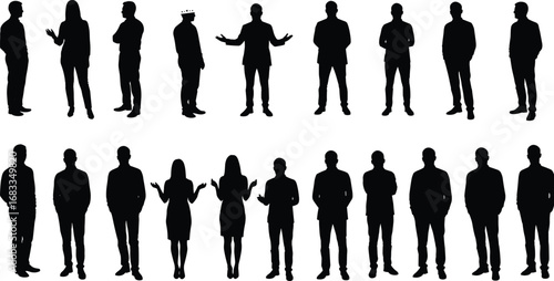 Silhouettes of men and women in various poses, business people standing, talking, gesturing, for office, presentation, and teamwork concepts.