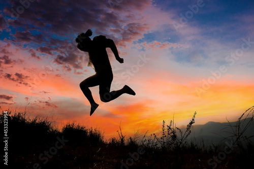 Silhouettes of men jumping with joy and freedom In the meadow during the evening time. man jump high and step on the sun in the silhouette.