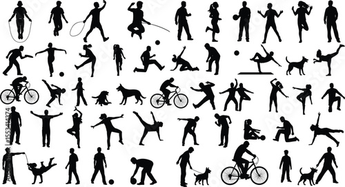 Silhouettes of people and dogs in motion, outdoor activity, exercise, fitness, biking, jumping, playing, running, walking, lifestyle collection