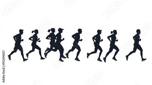 silhouette, running, people, person, runner, man, woman, motion, race, marathon, fitness, sport, active, athlete, finish, line, group, black, white, background, jogging, track, field, stride, footwear, shoe, sneaker, leg, body, arm, hair, head, hat, side, profile, fast, healthy, energetic, move, dynamic