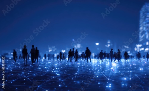 people, walking, night, city, light, network, technology, connection, blurred, silhouette, digital, future, urban, modern, connectivity, communication, progress, innovation, global, crowd, movement, futuristic, blue, dark, light, dot, line, interactive, abstract, perspective, horizon, infrastructure, pattern, graphic, visual, design, contemporary, artistic, illustration, animation, image, rendering