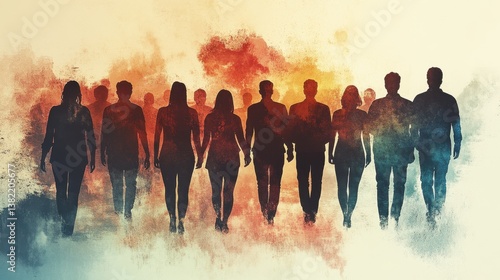 silhouette, people, oneness, walking, light, hope, community, together, abstract, sunset, freedom, support, diversity, equality, movement, strength, journey, solidarity, symbolic, social, concept, humanity, art, backlight, group, collective, peace, gathering, emotion, activism, cooperation, resilience, inclusion, visual, spiritual, society, crowd, purpose, landscape