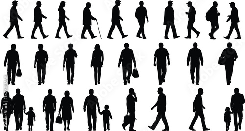 silhouette, people, walking, urban, family, elderly, adult, children, crowd, vector, lifestyle, diversity, casual attire, cane, motion