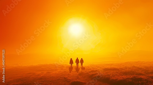 Silhouettes of Three People Walking Under Vibrant Sunset. Concept of Unity, Golden Landscape, Tranquil Evening, and Nature's Beauty