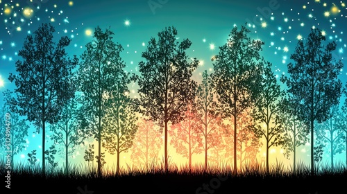 tree, forest, night, dawn, sunrise, star, glow, light, nature, landscape, silhouette, colourful, vibrant, magic, mystical, peaceful, tranquil, beautiful, scenic, timberland, aethereal, glowing, twilight, sunset, outdoors, summer, fall, spring, winter, night sky, fantasy, abstract, art, design, illustration, wallpaper, background, digital, graphic, pattern, texture