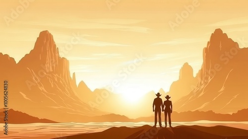 Silhouettes of two cowboys standing against a vibrant sunset in a desert landscape with mountains.