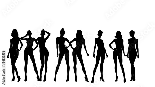 silhouette, woman, vector, people, fashion, body, illustration, model, beauty, black, girl, lady, group, dancer, dress, fun, dance, hair, art, pose, outline, posing, style, figure, clothing
