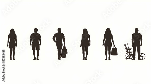 group, person, shadow, fashion, male, bag, black, figure, people, design, disability, silhouette, adult, standing, walking, human, graphic, woman, accessibility, silhouette, mobility, inclusion, crowd, white, wheelchair, isolated, vector, shape, icon, illustration, style, shopping, travel, diverse, outline, clip art
