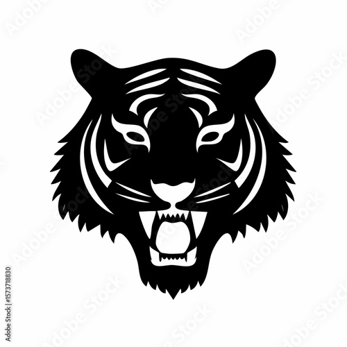 Siluette of a tiger's head, with its striped face and aggressive expression, emphasizing the sharpness of its teeth