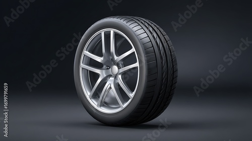 Silver Alloy Wheel with Black Tire and Tread Pattern Displayed on a Gray Background