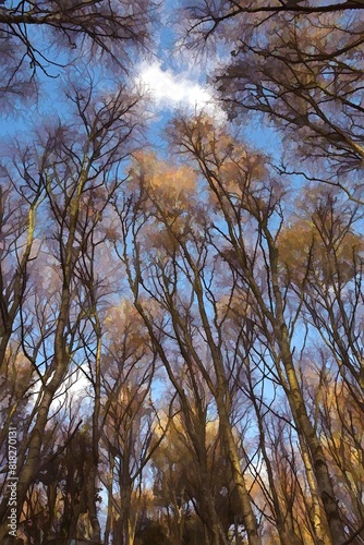 outdoors, day, daytime, remote, impression, wood, height, tall, watercolor, england, technique, britain, technique, britain, impression, impressionistic, forest, high, blue skies, outside, tree, forest, autumn, fall, tree, through, color image, watercolor, silver birch, no people, impressionist